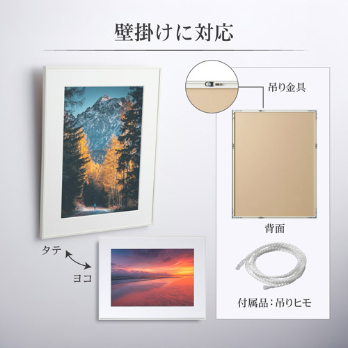 作品を引き立たせる細身のフレームとワイドマット![]() 細身のフレームとワイドマット、Vカット加工による奥行き感が展示会などで作品をより引き立たせます。 壁掛けに対応![]() 付属の吊りヒモと裏面の吊り金具を使用して、タテ・ヨコどちらの向きでも壁掛けが可能です。 軽くて割れにくい高透明アクリル板を採用![]() 前面板にはガラスよりも軽くて割れにくく、扱いやすいアクリル板を使用しています。高い透明度を持ち、作品本来の美しさを損なうことなく飾ることができます。また、耐候性にも優れており、環境や経年変化による劣化が少ないので、長期間にわたって作品を美しい状態に保つことができます。 製品サイズ![]() 製品仕様![]() フレーム形状イメージ図![]() 背面仕様![]() 画像はホワイト 日本製の高品質なアルミフレーム![]() 高品質な日本製アルミフレームを採用し、国内工場での厳格な品質管理のもと生産。安心してお使いいただけます。 ご使用方法(フレームのはずし方)![]() プラスまたはマイナスドライバーをご用意ください。 作品メモを書き込めるパッケージ![]() パッケージは、しっかりとした段ボール素材を採用。表面には、展示会への提出や収納する内容の記載などに使える便利なメモ欄が付いています。(画像はA4) 複数枚の使用イメージ![]() 使用イメージ![]() (画像はシルバー) 使用イメージ![]() (画像はシルバー) サイズ違い複数枚の使用イメージ![]() |