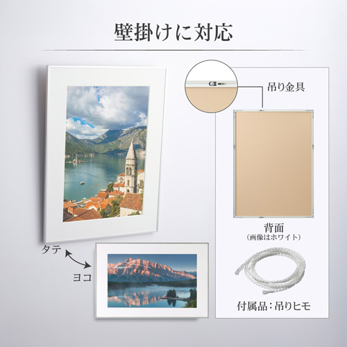作品を引き立たせる細身のフレームとワイドマット![]() 細身のフレームとワイドマット、Vカット加工による奥行き感が展示会などで作品をより引き立たせます。 壁掛けに対応![]() 付属の吊りヒモと裏面の吊り金具を使用して、タテ・ヨコどちらの向きでも壁掛けが可能です。 軽くて割れにくい高透明アクリル板を採用![]() 前面板にはガラスよりも軽くて割れにくく、扱いやすいアクリル板を使用しています。高い透明度を持ち、作品本来の美しさを損なうことなく飾ることができます。また、耐候性にも優れており、環境や経年変化による劣化が少ないので、長期間にわたって作品を美しい状態に保つことができます。 製品サイズ![]() 製品仕様![]() フレーム形状イメージ図![]() 背面仕様![]() 画像はホワイト 日本製の高品質なアルミフレーム![]() 高品質な日本製アルミフレームを採用し、国内工場での厳格な品質管理のもと生産。安心してお使いいただけます。 ご使用方法(フレームのはずし方)![]() プラスまたはマイナスドライバーをご用意ください。 作品メモを書き込めるパッケージ![]() パッケージは、しっかりとした段ボール素材を採用。表面には、展示会への提出や収納する内容の記載などに使える便利なメモ欄が付いています。(画像はA4) 複数枚の使用イメージ![]() 使用イメージ![]() 使用イメージ![]() サイズ違い複数枚の使用イメージ![]() |