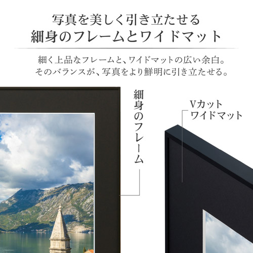 奥行き感のあるフレームは高品質な日本製。コーナー金具のネジをゆるめて短辺から出し入れができる、位置決めのしやすい差し込み式フレームです。Vカットの中抜き加工により額縁に奥行き感を与え、作品をより引き立たせます。