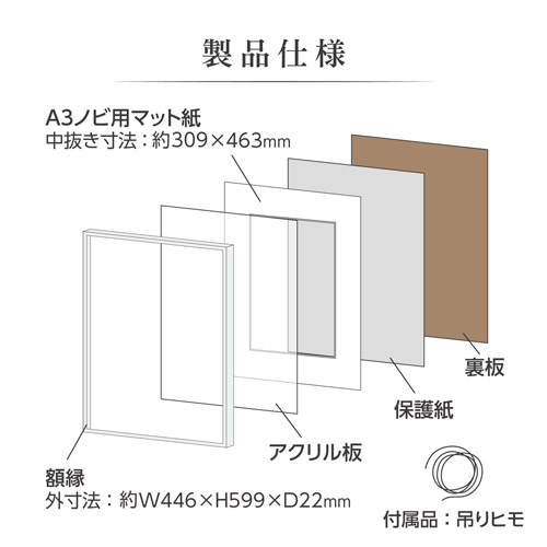 作品を引き立たせる細身のフレームとワイドマット![]() 細身のフレームとワイドマット、Vカット加工による奥行き感が展示会などで作品をより引き立たせます。 壁掛けに対応![]() 付属の吊りヒモと裏面の吊り金具を使用して、タテ・ヨコどちらの向きでも壁掛けが可能です。 軽くて割れにくい高透明アクリル板を採用![]() 前面板にはガラスよりも軽くて割れにくく、扱いやすいアクリル板を使用しています。高い透明度を持ち、作品本来の美しさを損なうことなく飾ることができます。また、耐候性にも優れており、環境や経年変化による劣化が少ないので、長期間にわたって作品を美しい状態に保つことができます。 製品サイズ![]() 製品仕様![]() フレーム形状イメージ図![]() 背面仕様![]() 画像はホワイト 日本製の高品質なアルミフレーム![]() 高品質な日本製アルミフレームを採用し、国内工場での厳格な品質管理のもと生産。安心してお使いいただけます。 ご使用方法(フレームのはずし方)![]() プラスまたはマイナスドライバーをご用意ください。 作品メモを書き込めるパッケージ![]() パッケージは、しっかりとした段ボール素材を採用。表面には、展示会への提出や収納する内容の記載などに使える便利なメモ欄が付いています。(画像はA4) 複数枚の使用イメージ![]() 使用イメージ![]() (画像はシルバー) 使用イメージ![]() (画像はシルバー) サイズ違い複数枚の使用イメージ![]() |