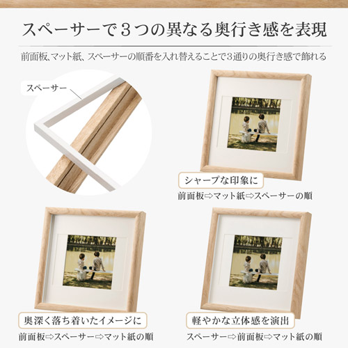 前面板やスペーサーの順番を入れ替えることで、3通りの異なる奥行き感を表現できる木製フォトフレーム。美しい天然木の木目があたたかい雰囲気を演出します。