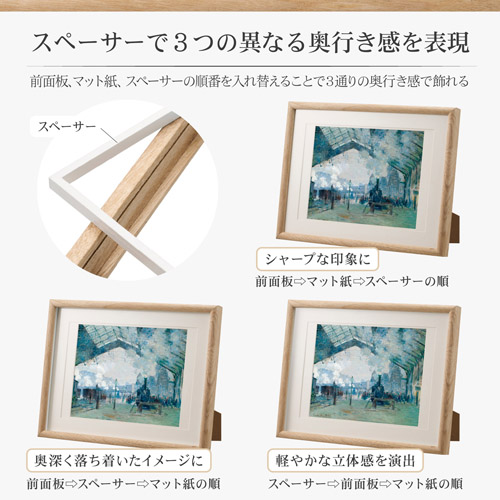 | スペーサーで3つの異なる奥行き感を表現 写真と前面版の間に空間を作り出し、立体感を演出するための約8mmの厚みのスペーサーを採用しています。前面板・マット紙と合わせ、3つのパーツの順番を入れ替えることで、作品や飾る場所に合わせて3通りの異なる奥行き感で写真を飾ることができます。※仕様上、写真が浮きやすい場合があります。写真がずれないよう、マット紙にテープ等で固定してからセットしてください。 [奥行き感 1]シャープな印象に 前面板 → マット紙 → 写真 → スペーサーの順に配置することで、写真が前面にぴたりと密着し、シャープでモダンな雰囲気に。写真そのものの存在感を際立たせたいときに最適です。 [奥行き感 2]軽やかな立体感を演出 スペーサー → 前面板 → マット紙 → 写真の順に配置することで、ほどよい奥行き感を生み出し、写真に軽やかな立体感が加わります。 [奥行き感 3]奥深く落ち着いたイメージに 前面板 → スペーサー → マット紙 → 写真の順に配置することで、写真がフレームの奥に収まり、落ち着いた印象になります。 6切サイズとA4サイズの写真に対応 付属のマット紙を入れ替えることで、6切サイズとA4サイズの写真に対応します。 壁掛けと卓上どちらにも対応 付属品の吊りヒモと裏面の吊り金具を使用して壁掛けでの使用が可能です。背面には、タテ置き、ヨコ置きどちらでも飾れる折りたたみ式のスタンドも付いています。 天然木の温もりを引き立てるやわらかな曲線デザイン 芯材にMDF(木質繊維板)を使用し、その表面に天然木を薄くスライスした突板を貼り付けて仕上げています。反りや歪みが少なく、天然木の表情を長くお楽しみいただけます。天然木のため、節や木目、色合いに個体差がございます。 フレーム形状イメージ 柔らかな曲線を描くアーチデザインは、主張し過ぎずどんなインテリアにもしっくりと馴染み、天然木の美しい木目が、お部屋にあたたかい雰囲気を作り出します。 軽くて割れにくい高透明アクリル板を採用 前面板にはガラスよりも軽くて割れにくく、扱いやすいアクリル板を使用しています。高い透明度を持ち、作品本来の美しさを損なうことなく飾ることができます。また、耐候性にも優れており、環境や経年変化による劣化が少ないので、長期間にわたって作品を美しい状態に保つことができます。 アイデア次第で多彩なディスプレイを楽しめる 奥行きを活かして、写真と一緒にチケットの半券やキーホルダーなどの思い出のアイテムを飾ったり、ドライフラワーや雑貨小物等の立体物を中に飾ってディスプレイBOXのように使用したりすることもできます。マット紙を抜けば最大11mmの厚みまで額装できます。※額装物の重量によっては、スタンドや吊り金具に負荷がかかる場合があります。安定して設置できることをご確認のうえ、ご使用ください。 製品サイズ 製品仕様 パッケージ 使用イメージ 複数枚の使用イメージ 左:6切/A4サイズ、中央:L/KG/2Lサイズ |