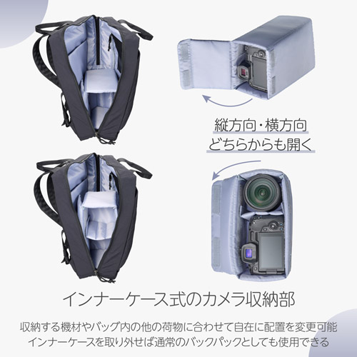 やさしい手触りで普段使いもしやすいインナーケース式のカメラバックパック