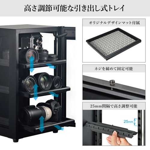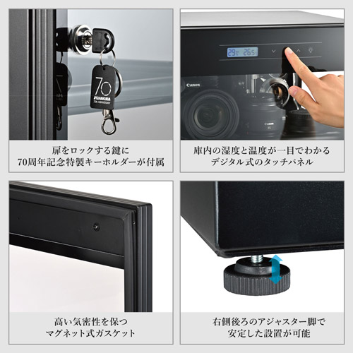 3面クリアでショーケースのように明るく美しくディスプレイできる![]() 前扉に加え、左右の側面にも透明で大きな強化ガラス製の窓を採用。従来の防湿庫に比べて庫内が格段に明るく見やすくなり、まるでショーケースのように自慢のカメラコレクションを美しくディスプレイできます。 コンパクトさと収納力のバランスが良い60リットルサイズ![]() 一眼カメラをメインに、中判カメラや大きめの交換レンズも入る容量60リットルタイプ。限られたスペースでも圧迫感なく設置できるコンパクトさと、増え始めたコレクションをしっかり保管できる収納力を両立した使い勝手の良いサイズ感です。 使いやすさにこだわった3段の引き出し式トレイ![]() 3段式のトレイは全て引き出し式を採用しており、奥に置いたカメラやレンズもスムーズに出し入れできます。トレイはネジを締めて固定することも可能です。トレイには、機材の滑り止めと傷防止に役立つオリジナルデザインのマットが付属しています。 トレイの高さは調節可能![]() 3段のトレイは、引き出し用のレールを取り外して高さを25mm間隔で調節できます。収納する機材のサイズに合わせてトレイの位置を自由に設定できるため、効率的な収納が可能です。 雰囲気に合わせて選べる3色LEDライト搭載![]() 庫内には白、青、ウォーム(電球色)の3パターンに切り替えられるLEDライトを前側の2か所に搭載。お部屋の雰囲気やディスプレイしたい機材に合わせて、照明の色を簡単に変更できます。トレイのマットにはライトに照らされることで美しい陰影を生み出すオリジナルデザインが施されており、光と影が織りなす空間が、一台一台のカメラを際立たせる特別な雰囲気を演出。大切なコレクションをより魅力的にディスプレイできます。 静音&省電力の除湿ユニット![]() 簡単操作のシンプルな設定だけで、デジタル制御の除湿ユニットが庫内を一定の湿度に保ちます。ファンやモーターなど音の出る部品を使用していないので運転時はほぼ無音、設定湿度よりも庫内湿度が高い場合にだけ除湿運転する省エネ設計です。さらに、除湿ユニットはメーカー3年保証付きなので安心して長くお使いいただけます。 デジタル式でスマートに湿度管理![]() 庫内の湿度と温度が一目で分かるデジタル式のタッチパネルを搭載。指先ひとつで湿度設定やLEDライトの色変更ができるため、直感的な操作でスマートに管理が行えます。湿度設定はカメラ・レンズの保管に適した35~45%を推奨します。 高い気密性を保つマグネット式ガスケット![]() 扉には、閉める際に強力な磁力で「ピタッ」と密着するマグネット式のガスケットを採用しています。高い気密性を保ち、大切な機材を湿気やホコリから確実に守ります。 扉をロックする鍵に70周年記念特製キーホルダーが付属![]() 前面扉は鍵でしっかりロックできるので、お子様のいたずらや不意に扉が開くのを防ぎ、大切な機材を安全に守ります。鍵には70周年記念のオリジナルロゴが入った特製キーホルダーが付属しています。 アジャスター脚で安定した設置が可能![]() 右側後ろの脚には、ねじ込み式のアジャスター機能を備えています。置き場所に多少の凹凸があっても、アジャスターを調整することで防湿庫のガタつきをなくし、安定した設置が可能です。 サイズ![]() 使用イメージ![]() 使用イメージ![]() 創立70周年![]() 2025年ハクバ写真産業は、おかげさまで創立70周年を迎えました。皆様からの日頃のご愛顧に心より感謝申し上げます。 |