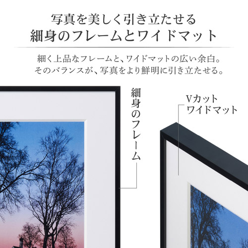 奥行き感のあるフレームは高品質な日本製。コーナー金具のネジをゆるめて短辺から出し入れができる、位置決めのしやすい差し込み式フレームです。Vカットの中抜き加工により額縁に奥行き感を与え、作品をより引き立たせます。