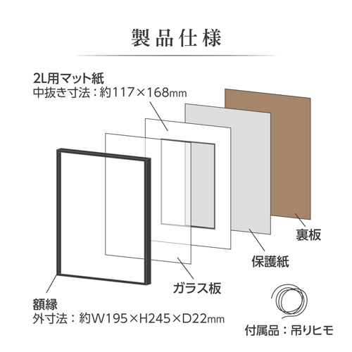 作品を引き立たせる細身のフレームとワイドマット![]() 細身のフレームとワイドマット、Vカット加工による奥行き感が展示会などで作品をより引き立たせます。 壁掛けと卓上どちらにも対応![]() 付属品の吊りヒモと裏面の吊り金具を使用して壁掛けでの使用が可能です。背面には、タテ置き、ヨコ置きどちらでも飾れる折りたたみ式のスタンドも付いています。 フレーム形状イメージ図![]() 製品サイズ![]() 製品仕様![]() 背面仕様![]() 日本製の高品質なアルミフレーム![]() 高品質な日本製アルミフレームを採用し、国内工場での厳格な品質管理のもと生産。安心してお使いいただけます。 ご使用方法(フレームのはずし方)![]() プラスまたはマイナスドライバーをご用意ください。 複数枚の使用イメージ![]() 使用イメージ![]() (画像はA3) サイズ違い複数枚の使用イメージ1![]() サイズ違い複数枚の使用イメージ2![]() |