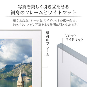 奥行き感のあるフレームは高品質な日本製。コーナー金具のネジをゆるめて短辺から出し入れができる、位置決めのしやすい差し込み式フレームです。Vカットの中抜き加工により額縁に奥行き感を与え、作品をより引き立たせます。
