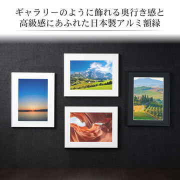 細身のフレームとワイドマットが作品を引き立たせる展示会等に最適なアルミ製額縁です。