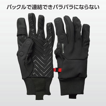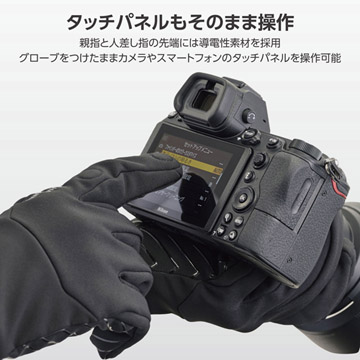 手を軽く握った自然な状態で形成された立体裁断フォルムにより、手の動きを妨げずスムーズにカメラの操作が行えるフォトグローブです。手のひら全体に施した滑り止めプリントで大切な機材をしっかりホールド。人差し指と親指の先端は指を出せる構造で、細かな作業も快適です。開閉部は衣服や肌を傷つける心配のないマグネット式で、指先には閉じた状態でもタッチパネル操作ができる導電性素材を採用しています。メイン生地には撥水加工、裏地には柔らかく温かいフリース素材を使用し、雨や寒さから手をしっかり守ります。