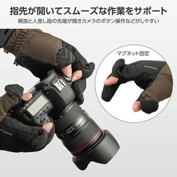 親指と人差し指の先端が開く構造なので、カメラのボタン操作など、繊細な作業もスムーズに行えます。開いた先端部分は邪魔にならないようマグネットでしっかり固定できます。面ファスナーのように衣服や肌を傷つけてしまう心配もありません。