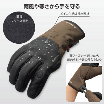 メイン生地に施された撥水加工が小雨程度の水滴を弾き、裏地のフリース素材が暖かさを保ちます。※完全防水ではありません。