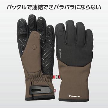 左右のグローブをバックルで連結できるため、持ち運び時にバラバラにならず、紛失を防ぎます。