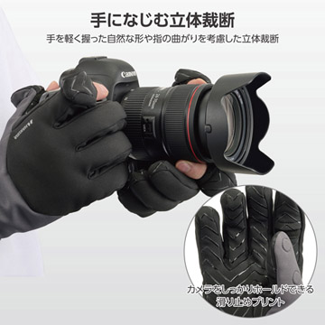 高性能断熱素材「PrimaLoft(R) Gold Insulation」を中綿に採用した、寒冷地仕様のフォトグローブです。手を軽く握った自然な状態で形成された立体裁断フォルムにより、手の動きを妨げずスムーズにカメラの操作が可能。手のひら全体に施した滑り止めプリントで大切な機材をしっかりホールドします。人差し指と親指の先端は指を出せる構造で、細かな作業も快適。開閉部はマグネット式なので、衣服や肌を傷つける心配がありません。メイン生地には撥水加工、裏地には柔らかく温かいフリース素材を使用し、雨や寒さから手をしっかり守ります。